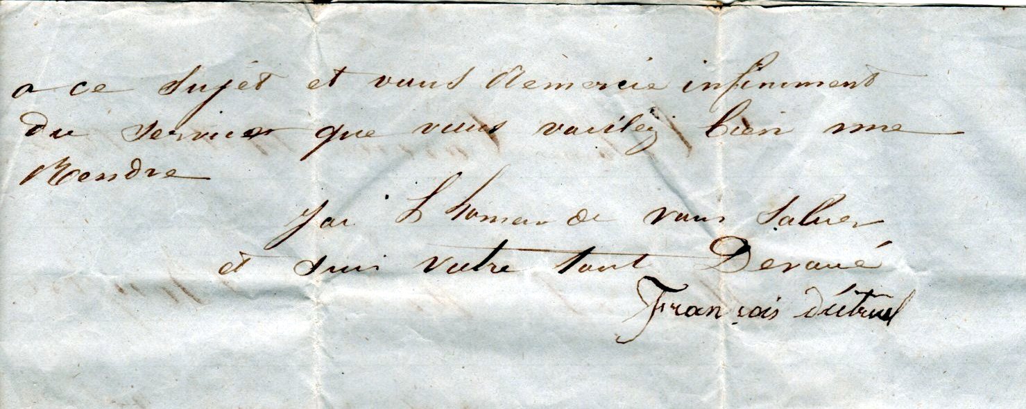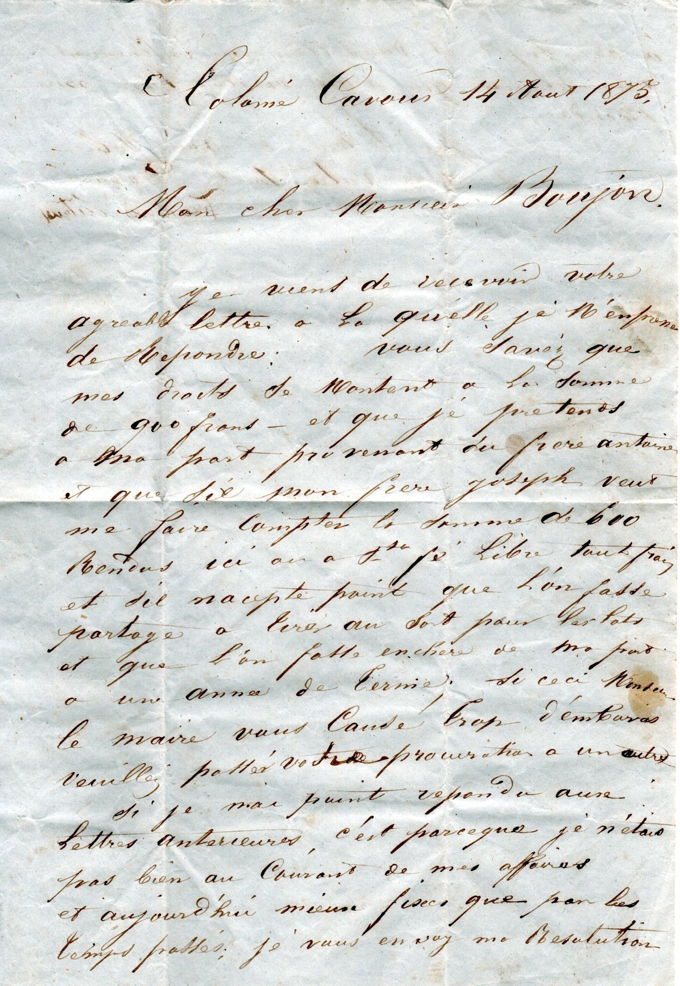 Vous savez que mes droits se montent à la somme de 900 francs, et que je prétends à ma part provenant du frère Antoine et que si mon frère Joseph veut me faire compter la somme de 600