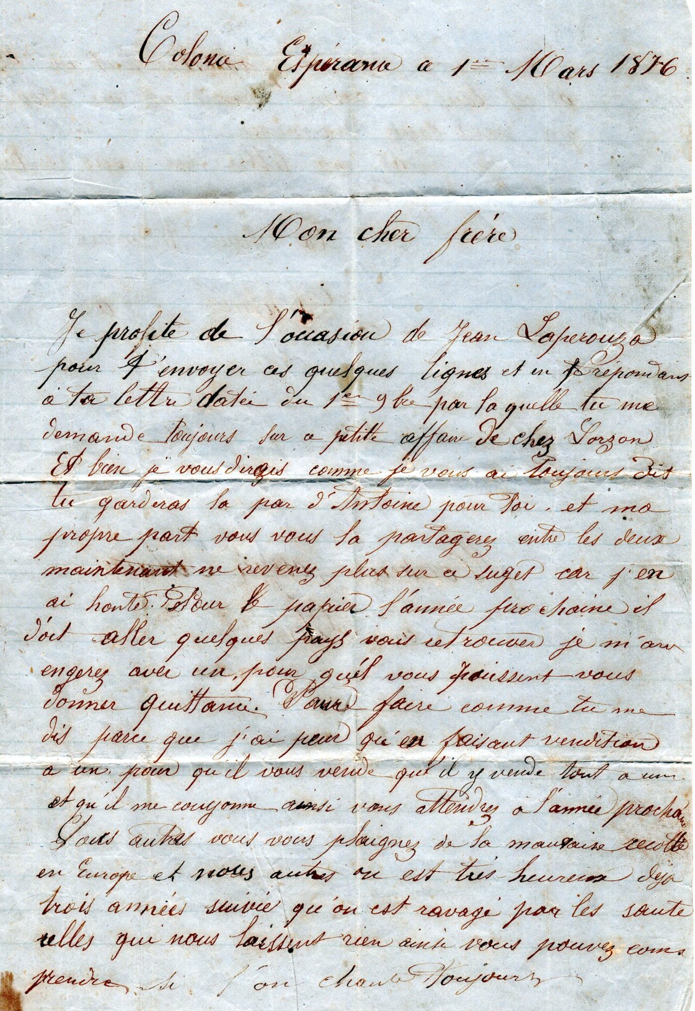 Je profite de l’occasion de Jean Laperouza pour t’envoyer ces quelques lignes et en répondant à ta lettre datée du 1er novembre par laquelle tu me demandes toujours sur cette petite affaire de chez Lorson.